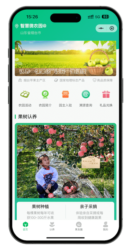线上果园展示与树木认养微农园将果园搬上平台,用户可直接认养果树,参与果树的生长过程。当苹果成熟后,我们将其直接送到用户手中,实现从枝头到餐桌的无缝连接 -