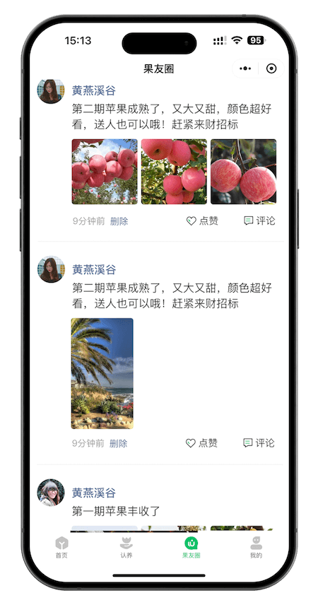 果友圈社交平台我们提供了一个专属的“果友圈”交流区,帮助果树认养者们互相交流种植经验、分享苹果成长的喜悦。果友圈不仅是一个互动平台,更是健康生活理念的延伸 -