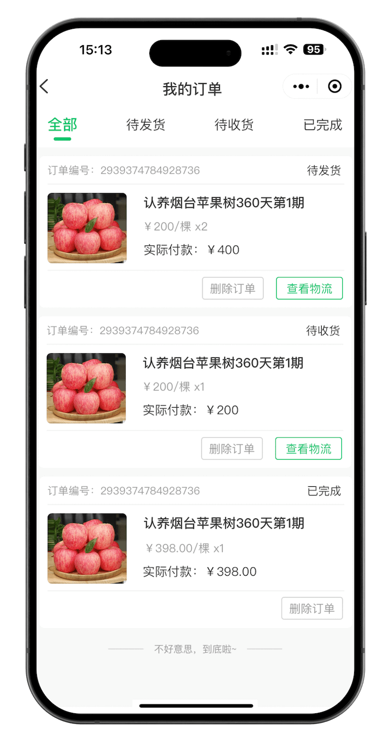 便捷订单管理简单易用的订单管理系统,全程跟踪苹果的采摘、发货状态,为用户带来放心的消费体验